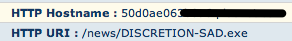 In the Sourcefire interface, we show you the hostname and URL that prompted the initial download of the file. In this case, it's not so obvious to tell if this one is malicious, but if we look at the http header of the file being actually downloaded:
